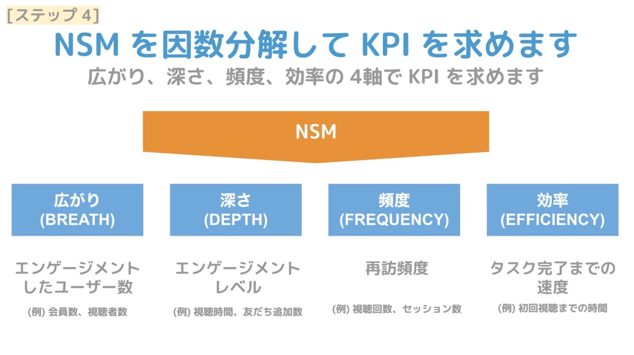 さらにNSMの設定後は、各部門が「何をすればNSMを達成できるのか」を意識したKPIに落とし込むプロセスが必要となる。その例を図3(クリックして拡大可能)に示す。ここでは、「オンライン動画配信サービスの例として、広がり、深さ、頻度、効率の4軸でKPIを設定しています」(米田氏)。