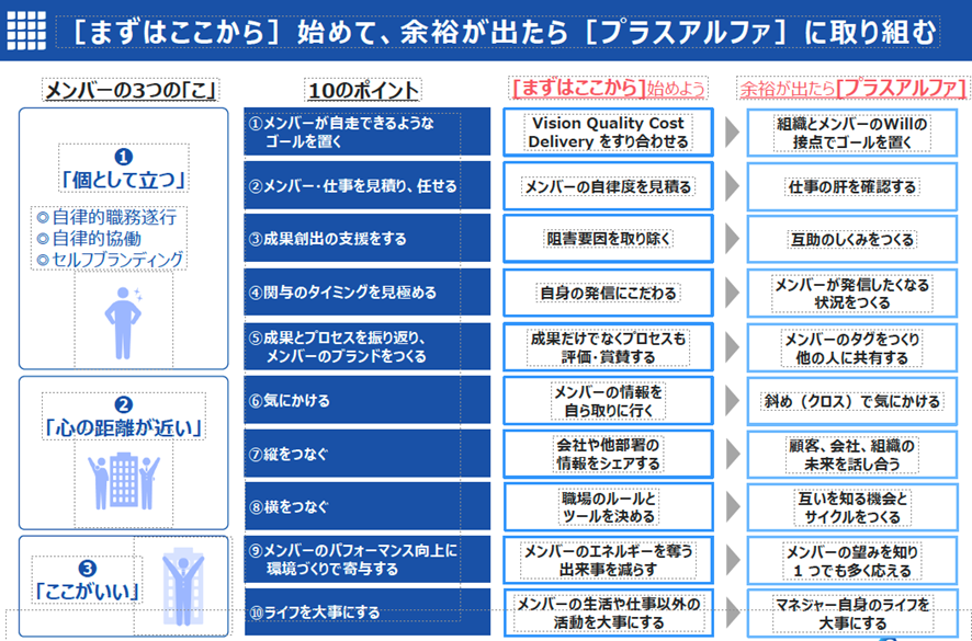 この状況下では、冒頭で記したように新人や若手メンバーが成長しない、必要以上に苦労する、孤独感に苛む、一体感が醸成されない、優秀なメンバーの思いがけない離職、新しいチャレンジができない、そしてマネージャーの負荷のみが増大し疲弊するーーなどの問題が浮上しやすい。