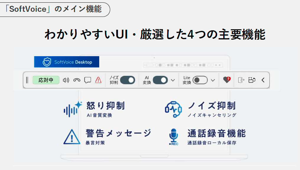 機能については上記リンクの記事に記載しているが、端的にまとめると(1)AIによる音質変換、(2)ノイズキャンセリング、(3)警告メッセージ、(4)通話録音機能――を主要機能とするソリューションだ。とくに目玉となっているのが(1)音質変換で、顧客の発言(内容)をそのままで、「怖くない声」に変換する技術である。