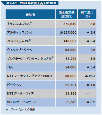 コールセンター向けBPO市場の規模は、調査会社によって多少の差はあるものの、「約1兆円」という見方が強い。2024年の上位各社の売上高は図の通りだが、この中にはコールセンターの受託以外のデジタルマーケティング・ビジネスなどの業績が多分に混在していることを考慮に入れて見るべきだ。
