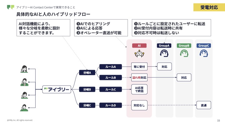 アイブリーAI Contact Centerは、AIと人の協奏を実現する基盤として開発した。問い合わせ電話の一次対応をAIが担い、ユーザー(顧客)の発話を認識して、「AIによる自動応答」や「AIによるヒアリングを経由してからオペレータへ転送」「直接オペレータに接続」など最適な対応やルーティングを実行できる(図1)。繁忙期や深夜帯も対話型の音声AIが一次対応を担うことで、応対率100%の体制を実現するという。CSO補佐 コンタクトセンター事業統括責任者 Sales&Partner Allianceの岩間悠太氏は、「LLM(大規模言語モデル)活用は発話内容の意図認識に限定し、回答はルールベースとしたことで、ハルシネーションレスを実現しました」と説明する。