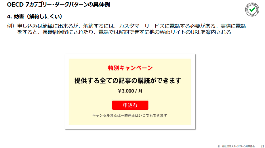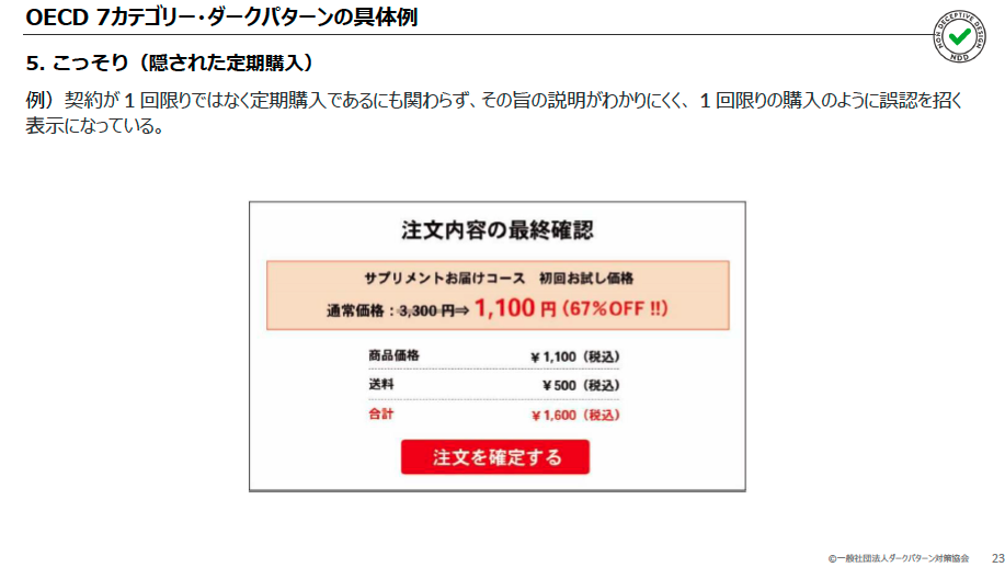 ダークパターンは、2010年にUXデザイナーのハリー・ブリヌル(Harry Brignull)氏が提唱。「ユーザーの意図に反して何かを購入させたり、登録させたりするなどの行動を取らせるために使われるトリック」と定義されている。2022年には経済協力開発機構(OECD)が7カテゴリー・24類型に整理した。