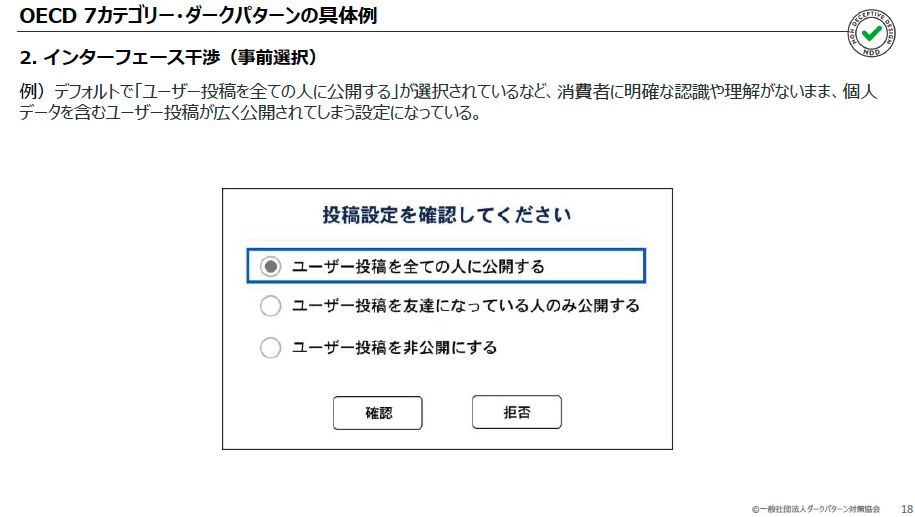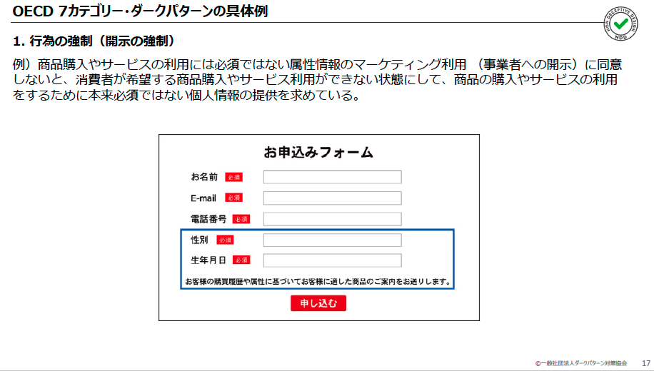 なかでも中心的な事業が「NDD(Non-Deceptive Design)認定制度」だ。「誠実なWebサイトを審査・認定し、改ざんできない認定マークを付与する制度」(石村氏)で、2025年10月に審査開始。審査にあたってのガイドラインは有識者、企業Web責任者、政府関係者(消費者庁、総務省、個人情報保護委員会事務局、経済産業省)で作成された。