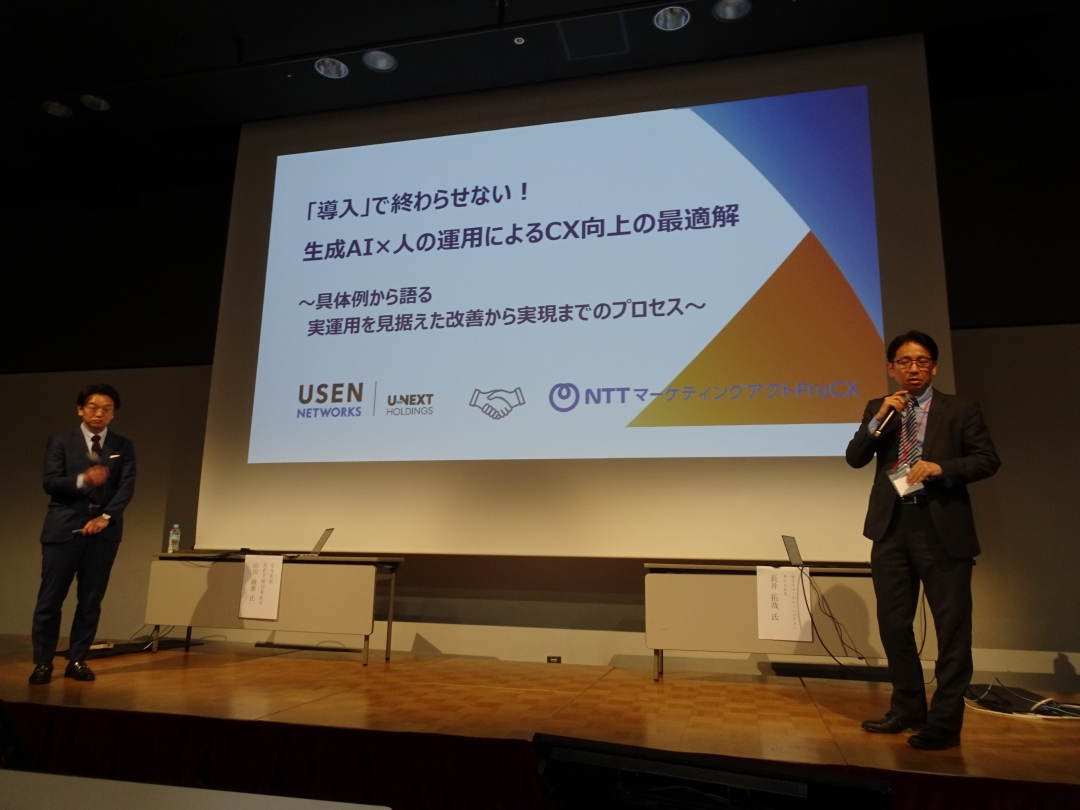 協賛社であるNTTマーケティングアクトProCXのCXソリューション部 取締役 営業部門部門長、長井 拓哉氏がクライアントであるUSEN NETWORKSの取締役副社長、山田 敏雅氏とともに登壇。同社における生成AIを活用した業務改革について、現在進行形の取り組みと今後の目標について説明した。