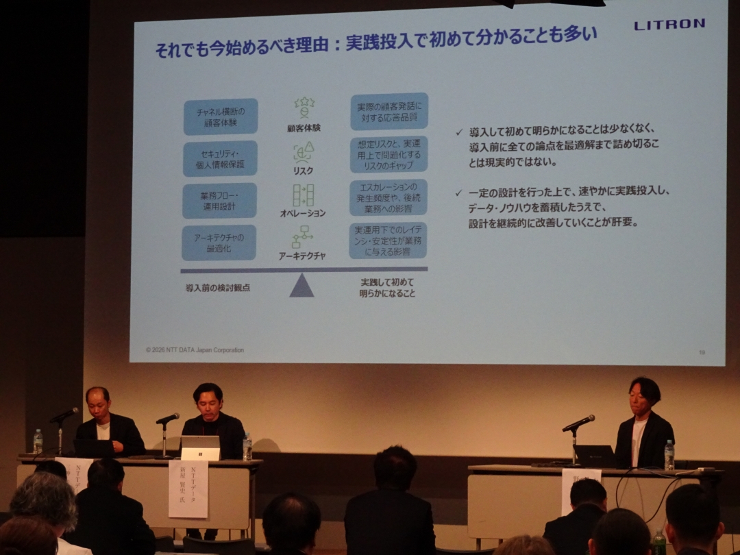 NTTデータからは、テクノロジーコンサルティング事業本部 テクノロジーコンサルティング事業部CX Transformation領域 統括部長の新屋 賢史氏、部長の三神 浩平氏、同事業本部インダストリセールス事業部課長の野瀬 裕氏が登壇。AIブランド「LITRON」と、その中核である「LITRON Customer Engagement」の機能を紹介しつつ、AIエージェントによるコンタクトセンター改革の重要性と実践のポイントをわかりやすく解説した。