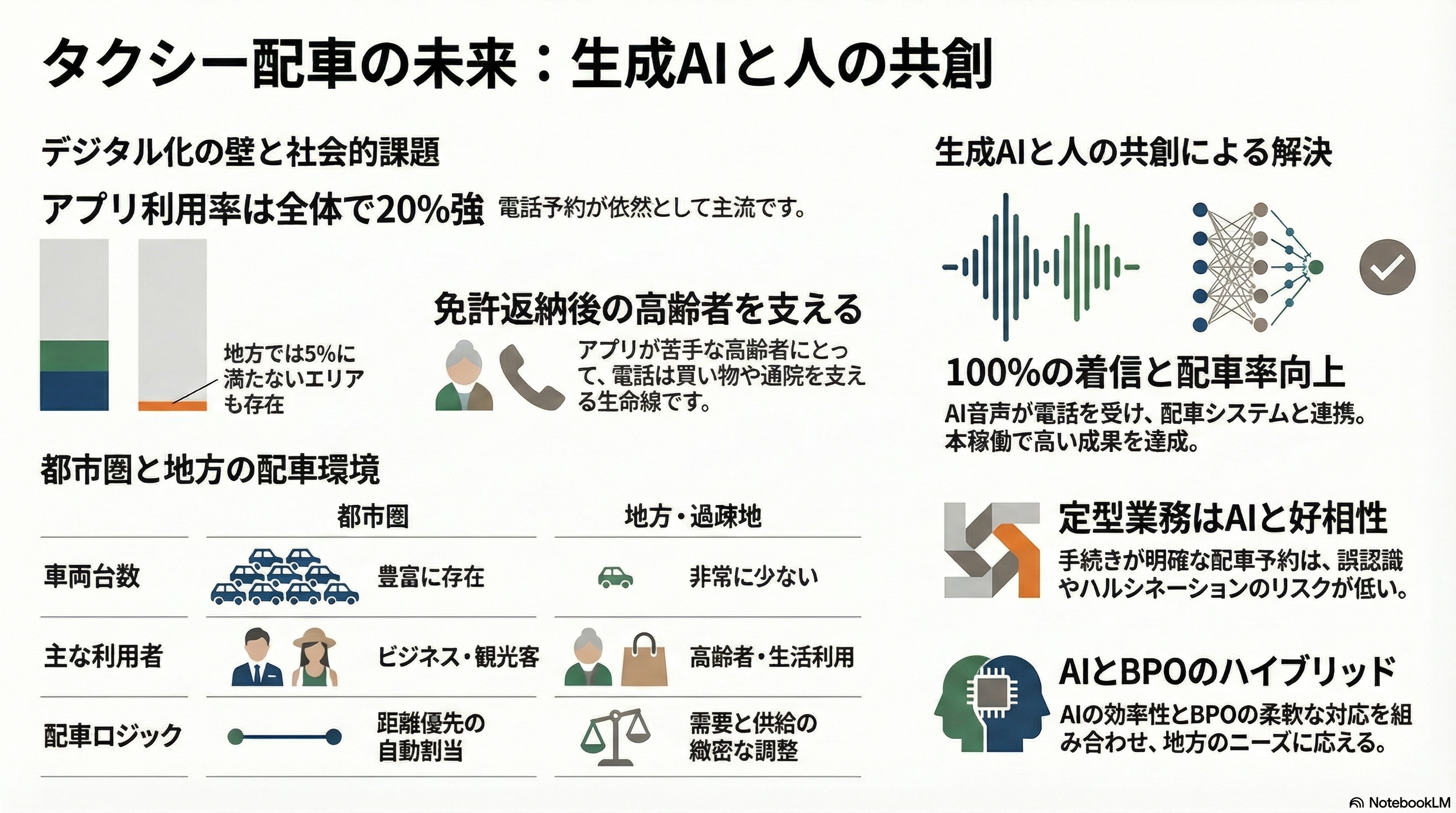 しかし、タクシーの配車に関しては、その「アプリでカバーできない範囲」の広さと業務の複雑さが大きな課題とされているのも事実だ。