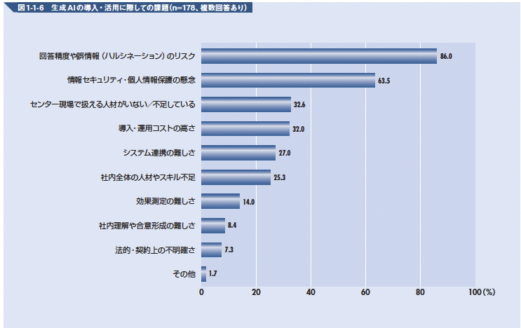 2025年の「コールセンター実態調査」において、生成AI活用の最大の課題は依然として「ハルシネーションのリスク」(86%)と「情報セキュリティ」(63.5%)が多数を占めた。