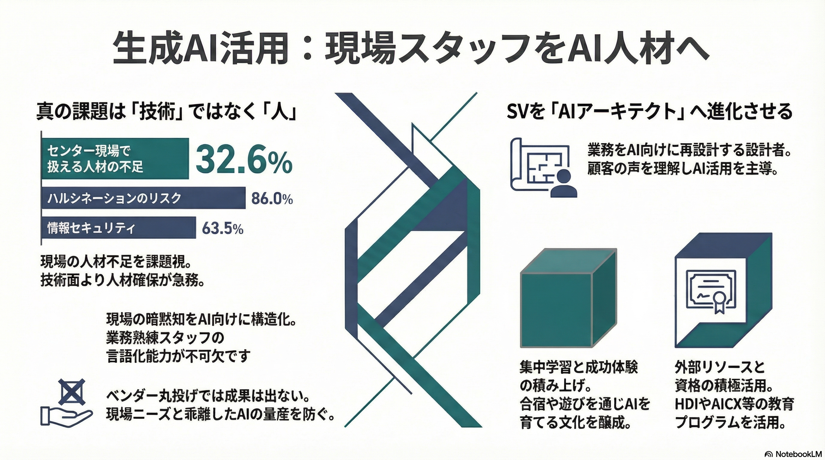 コンタクトセンターにおける生成AI活用は、「魔法の杖への期待」から「実運用を通じた現実的な課題解決」へのフェーズへと移行しつつある。多くの企業が「ハルシネーション」や「セキュリティ」を導入の障壁として挙げるが、真のボトルネックはテクノロジーそのものではなく、「現場業務を熟知し、AIを使いこなせる人材」の不足にある。