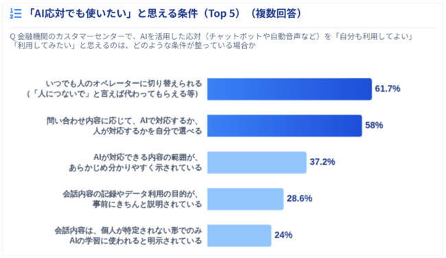調査結果では、回答者の約7割が生成AIの利用経験を持ち、約6割がポジティブな印象を持つ一方で、「どちらともいえない」とする回答も一定数あり、慎重な姿勢も見られた。また、「残高照会」や「手続き方法案内」などの定型的な問い合わせではAIの受容度が高い一方、「商品内容の相談」や「不正利用の疑い」などの複雑・高リスクな問い合わせでは、人による対応を求める傾向が強いことが明らかとなった。